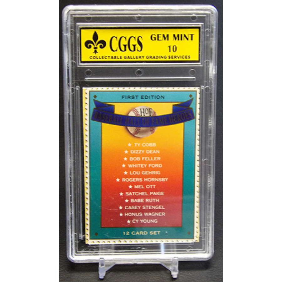 Baseball Hall of Fame Back Cover 1992 St. Vincent Hall of Fame Heroes baseball card. It is graded a CGGS 10 Gem Mint. There is some wearing of the case.