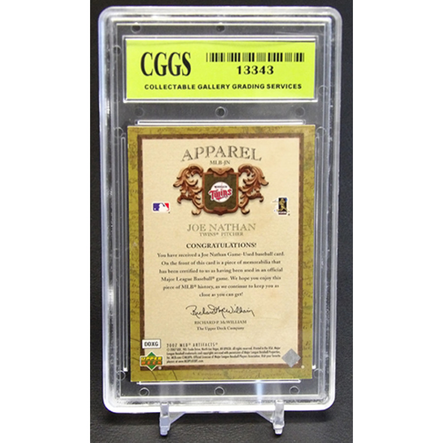 Joe Nathan Minnesota Twins 2007 Upper Deck Artifacts Apparel baseball card #MLB-JN. This is numbered 101 of 199. It is graded a CGGS 10 Gem Mint. There is some wearing of the case.
