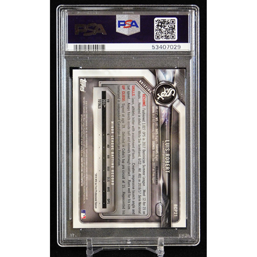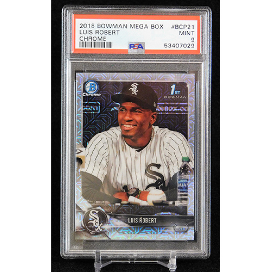 Luis Robert Chicago White Sox 2018 Bowman Chrome Mega Box baseball card #BCP21. It is graded a PSA 9 Mint.