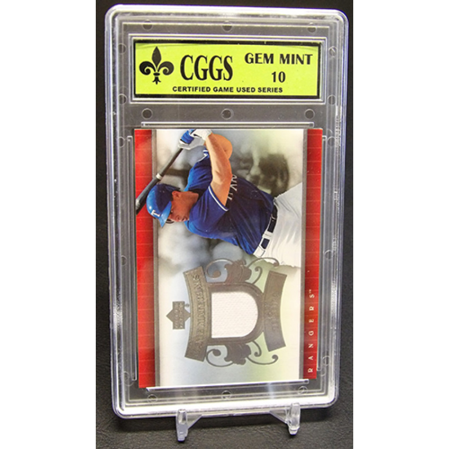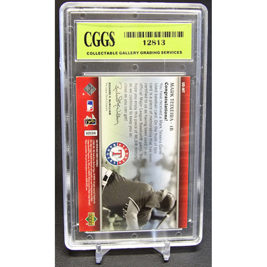 Mark Teixeira Texas Rangers 2007 Upper Deck Game Materials baseball card #UD-MT. It is graded a CGGS 10 Gem Mint. There is some wearing of the case.