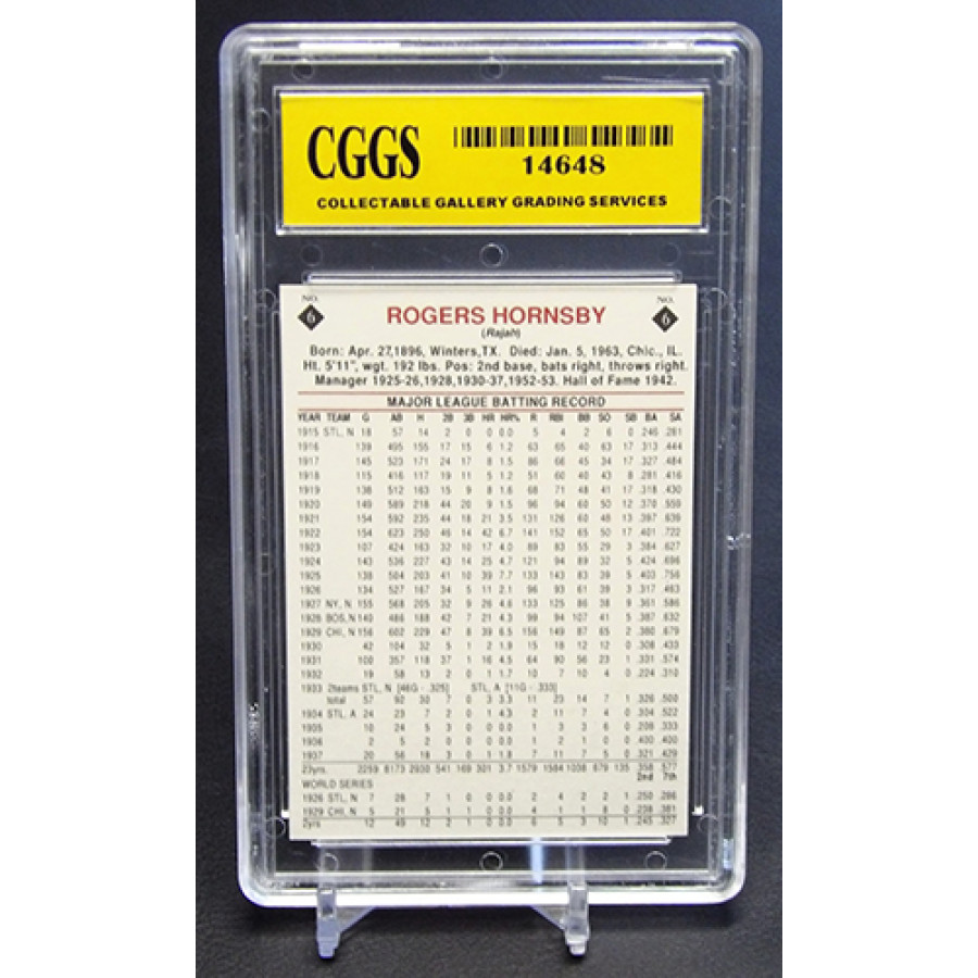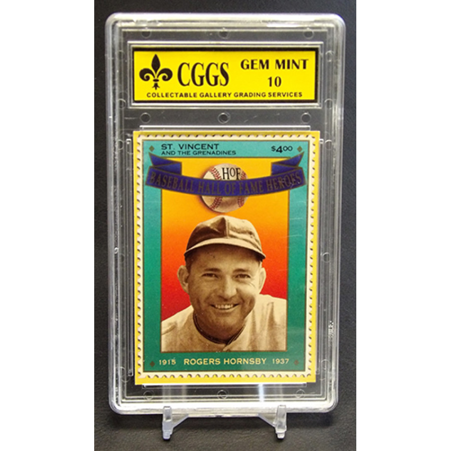 Roger Hornsby 1992 St. Vincent Hall of Fame Heroes baseball card #6. It is graded a CGGS 10 Gem Mint. There is some wearing of the case.