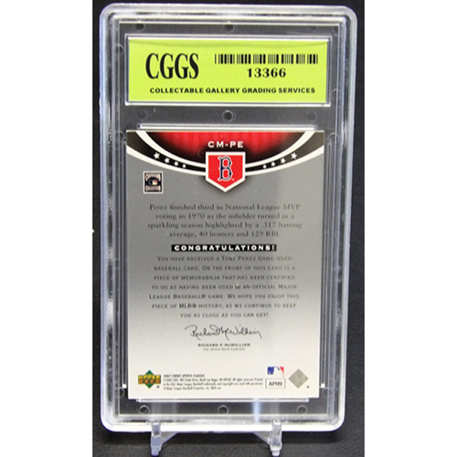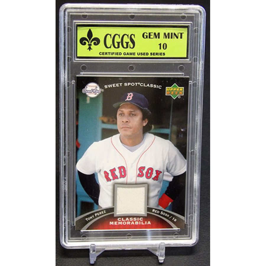 Tony Perez Boston Red Sox 2007 Upper Deck Sweet Spot Classic Memorabilia baseball card #CM-PE. It is graded a CGGS 10 Gem Mint. There is some wearing of the case.