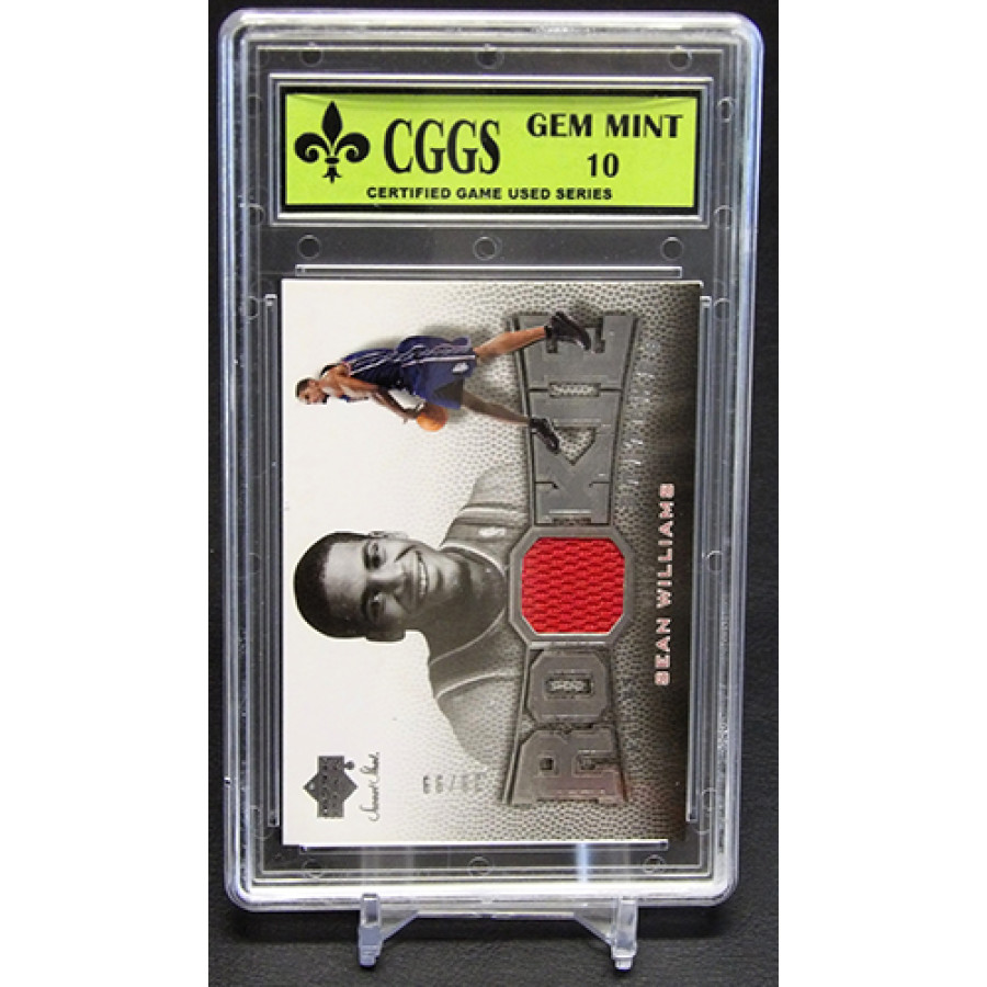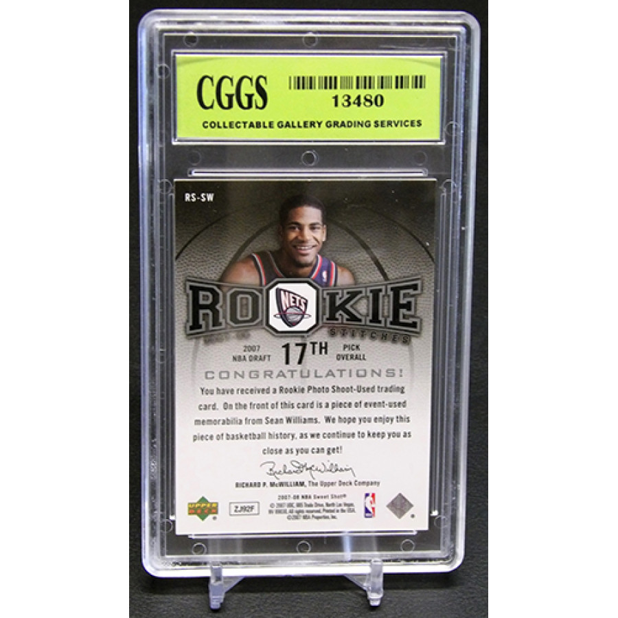 Sean Williams New Jersey Nets 2007-08 Upper Deck Sweet Shot Rookie Stitches Basketball Card #RS-SW. CGGS has graded this card a 10 Gem Mint. There is some wearing of the case.