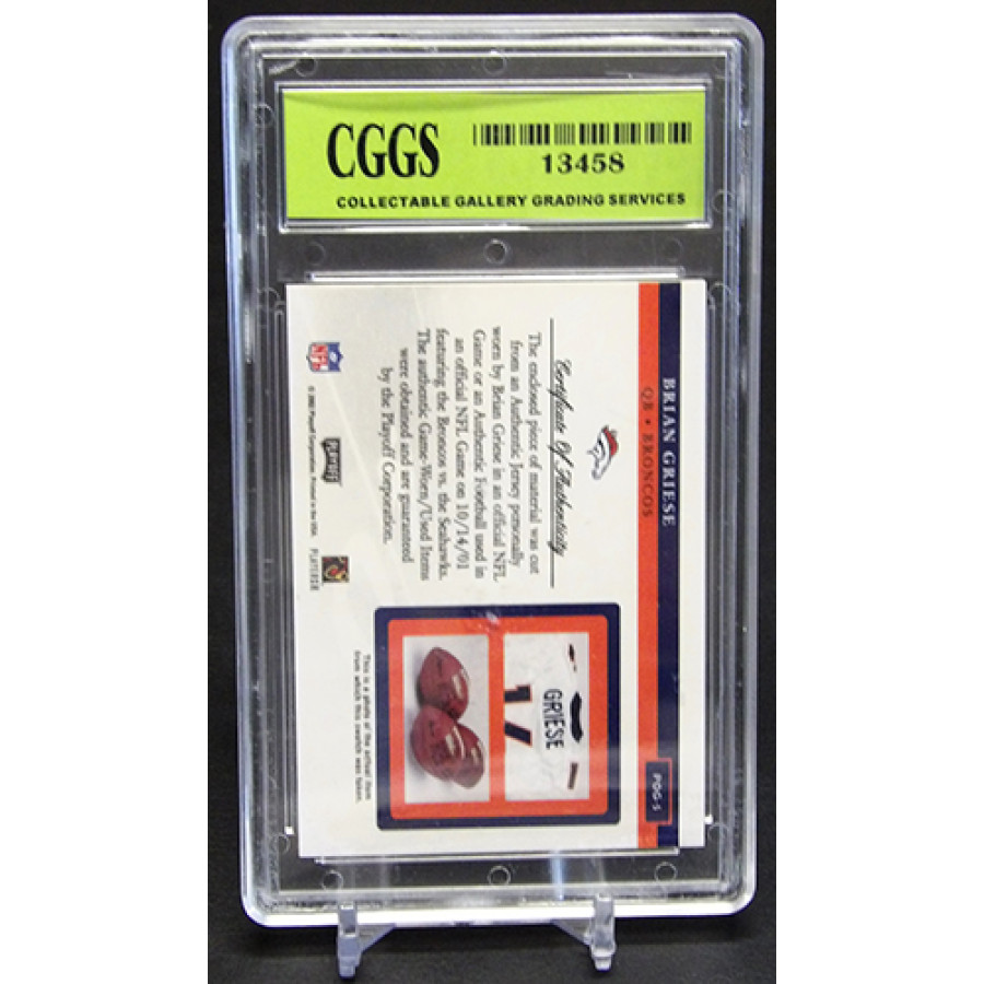 Brian Griese 2002 Playoff Piece of the game-worn Football Card #POG-5. CGGS has graded this card a 10 Gem Mint. The case has some wearing to it.