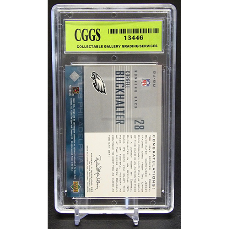 Correll Buckhalter Philadelphia Eagles 2003 Upper Deck Game Jersey Football Card #GJ-BU. CGGS has graded this card a 10 Gem Mint. The case has some wearing to it.