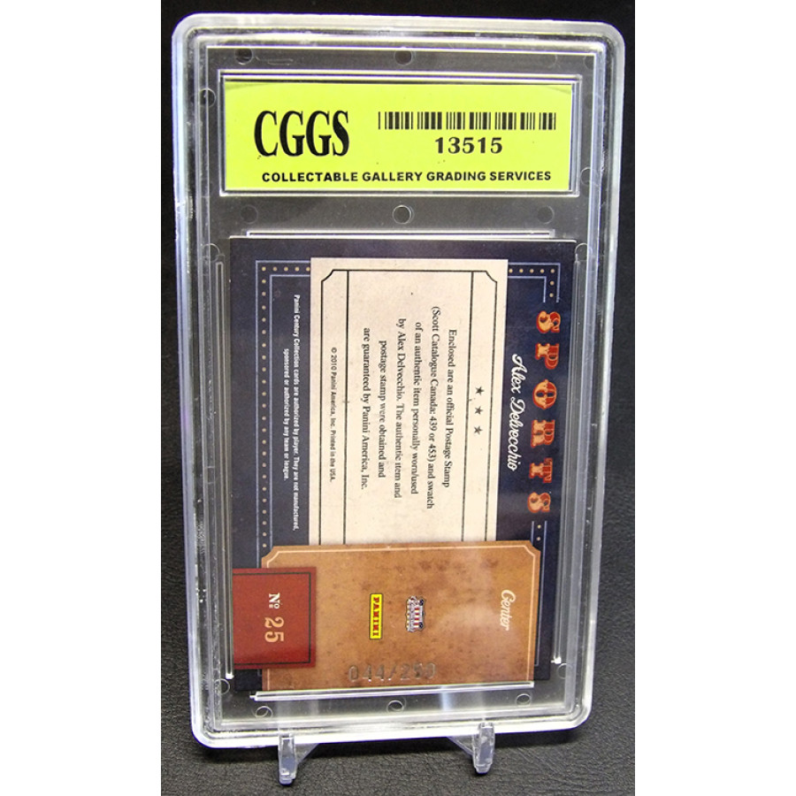 Alex Delvecchio 2010 Panini Century Collection Sports Souvenir Stamps material card #25. This is numbered 44 of 250. It is graded a CGGS 10 Gem Mint. There is some wearing of the case.