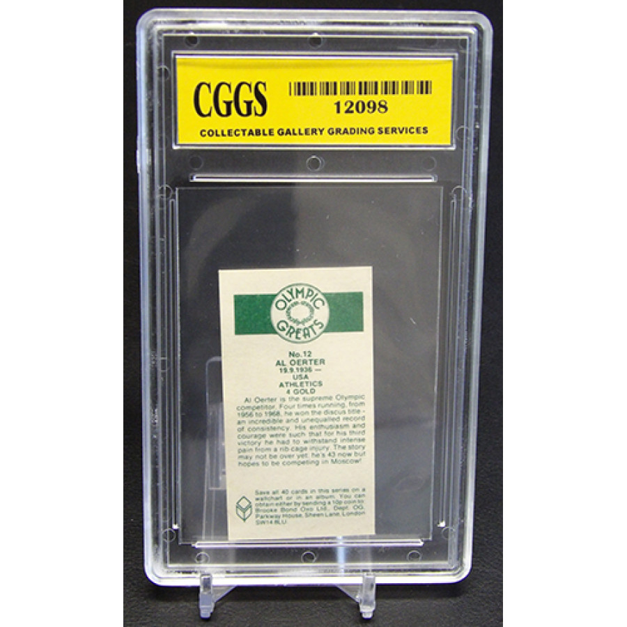 Al Oerter 1979 Brooke Bond Olympic Greats card #12. It is graded a CGGS 9 Mint. There is some wearing of the case.