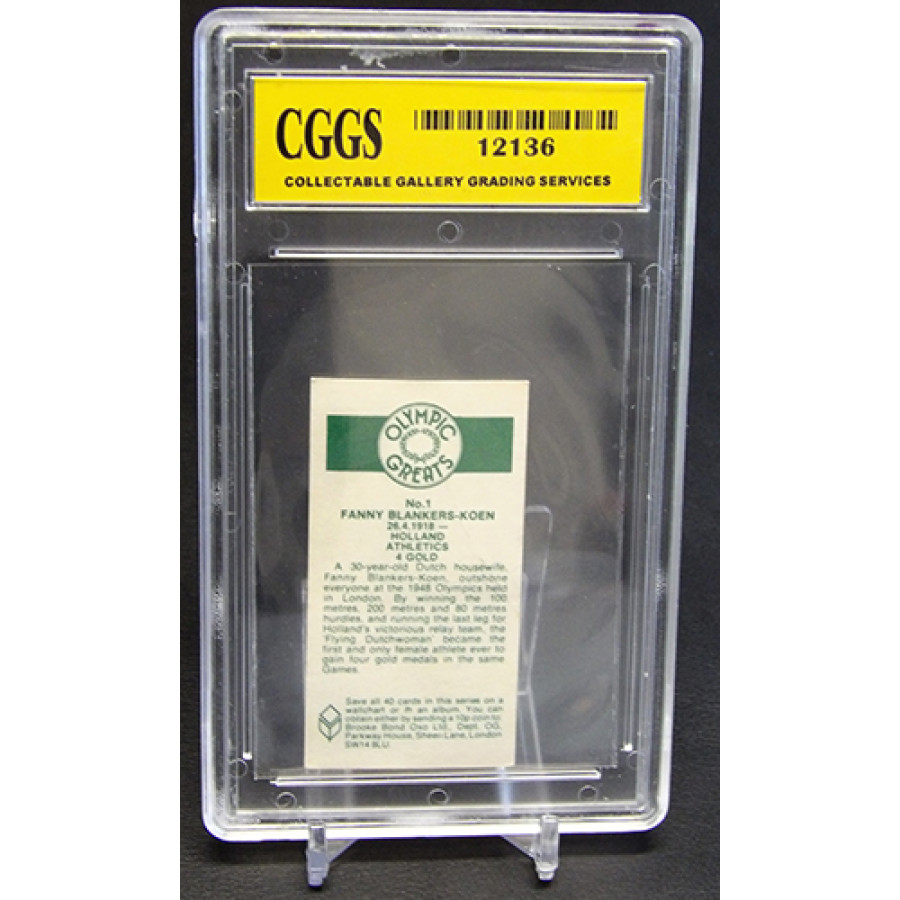 Fanny Blankers-Keon 1979 Brooke Bond Olympic Greats card #1. It is graded a CGGS 8 Near Mint. There is some wearing of the case.