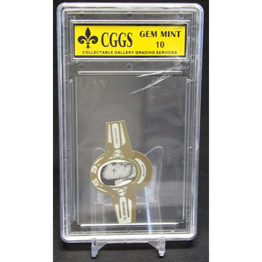 Henry Cooper 1979 Spanera Boksers Cigar Label #15. It is graded a CGGS 10 Gem Mint. There is some wearing of the case and a crack in the back.