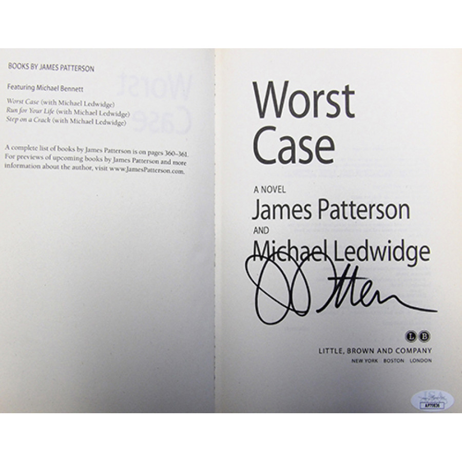 Signed James Patterson Worst Case first edition hardcover book in black ink on the inside cover page. The book is in used condition. This item is certified by James Spence Authentication (JSA) with sticker affixed to item and matching card.