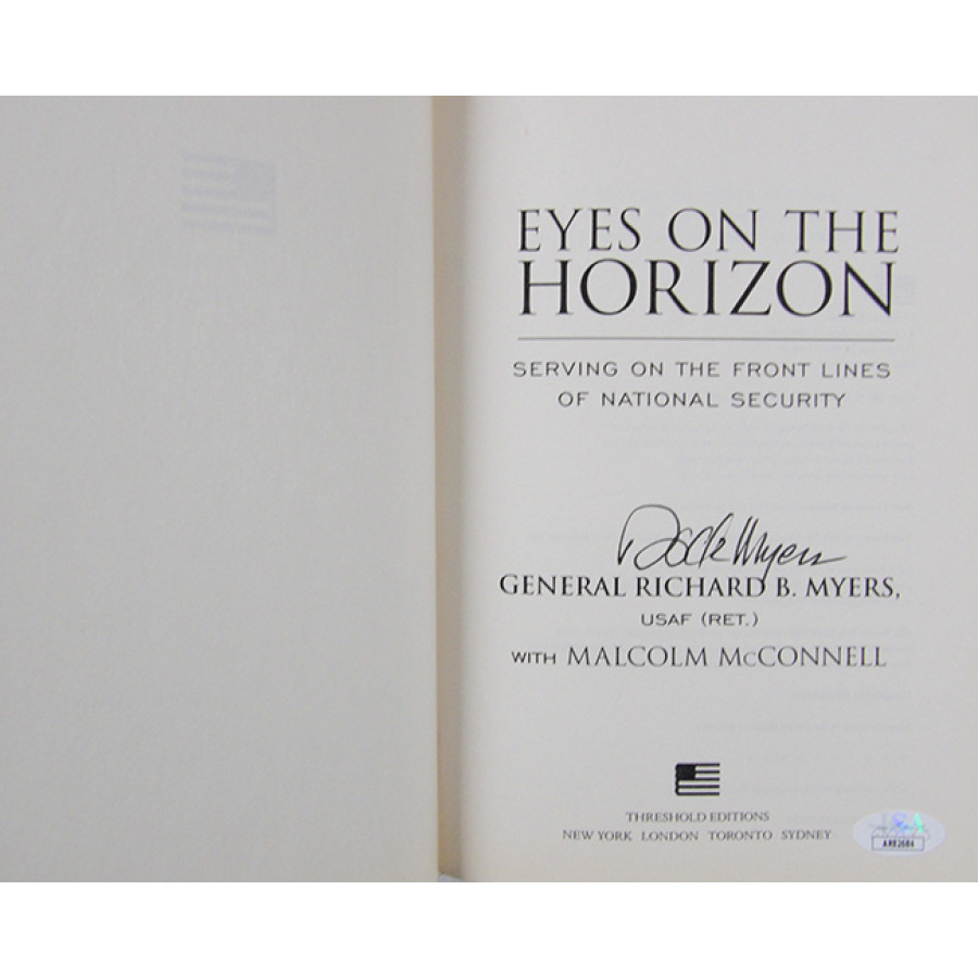 Signed Richard B. Myers Eyes On The Horizon first edition hardcover book in black ink on the inside cover page. This item has been certified by James Spence Authentication (JSA) with sticker affixed to item and matching card.