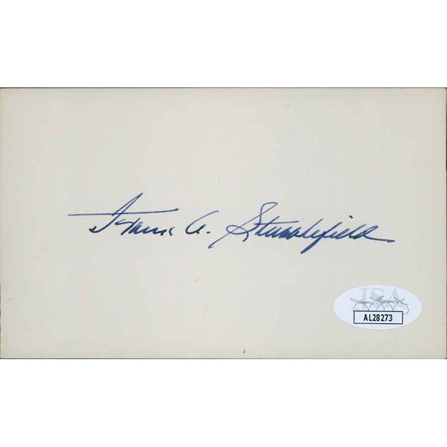 Signed Frank Stubblefield 3x5 index card in black ink. This item has been certified by James Spence Authentication (JSA) with sticker affixed to item and matching card.
