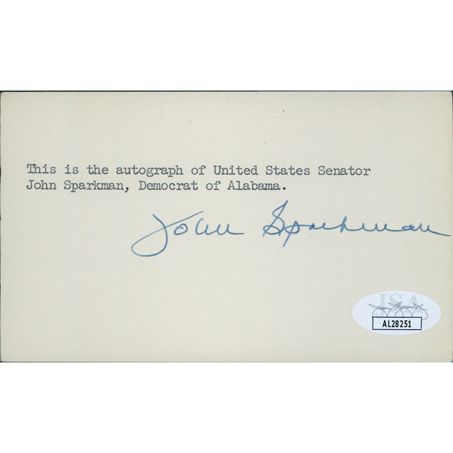 Signed John Sparkman 3x5 index card in blue ink. This item has been certified by James Spence Authentication (JSA) with sticker affixed to item and matching card.