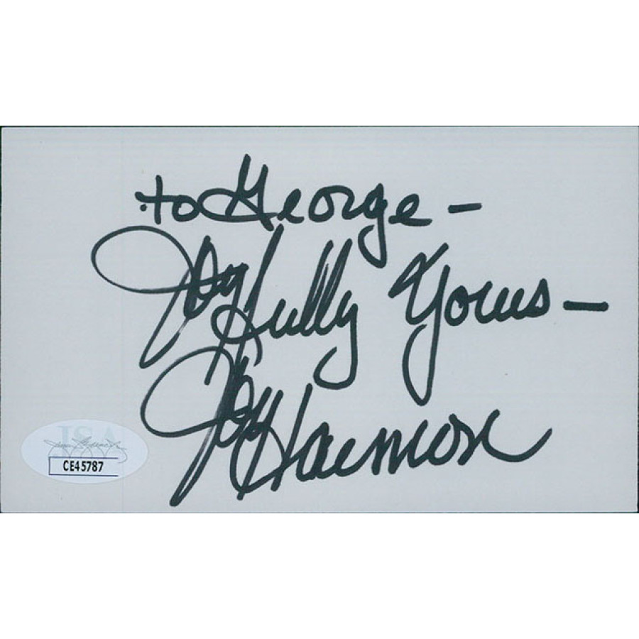 Signed Joy Harmon 3x5 index card in black sharpie personalized "To George". This item has been certified by James Spence Authentication (JSA) with sticker affixed to item and matching card.