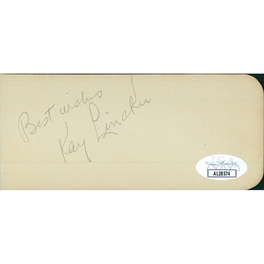 Signed Kay Linaker and Collette Lyons 2.25x5 Album Page in pencil and blue ink. This item has been certified by James Spence Authentication (JSA) with sticker affixed to item and matching card.