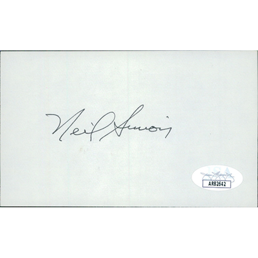 Signed Neil Simon 3x5 index card in black ink. This item has been certified by James Spence Authentication (JSA) with sticker affixed to item and matching card.