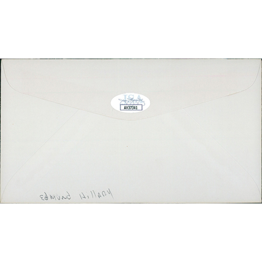 Signed Sir Edmund Hillary 3.5x6.5 envelope in black ink. This item is certified by James Spence Authentication (JSA) with sticker affixed to item and matching card.