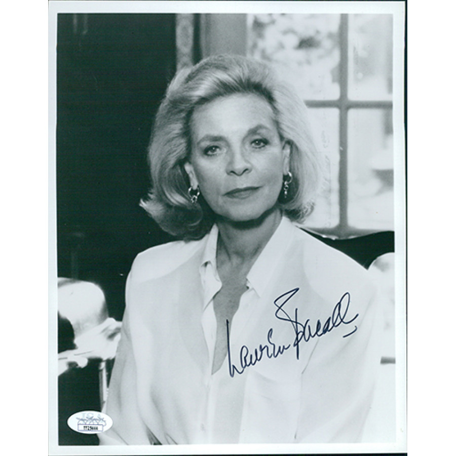 Signed Lauren Bacall 8x10 glossy photo in black ink. This item has been certified by James Spence Authentication (JSA) with sticker affixed to item and matching card.