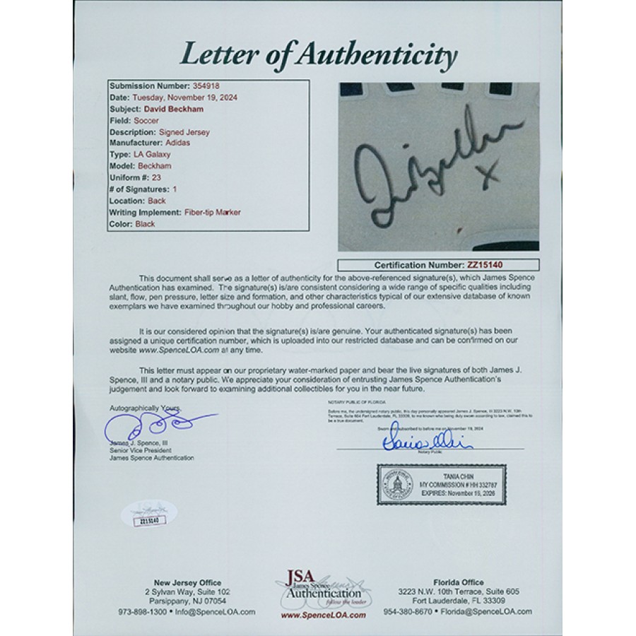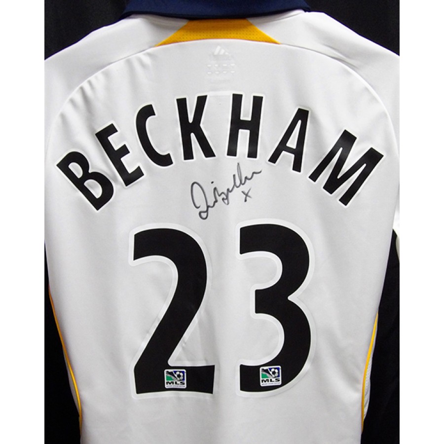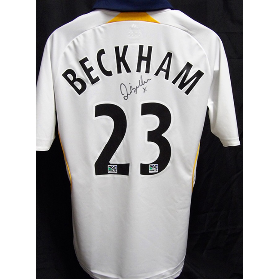 Signed David Beckham LA Galaxy Adidas replica jersey in black sharpie on the back. The jersey has some light stains around and also snags from what looks like of being previously framed. This item is certified by James Spence Authentication (JSA) with letter of authenticity.