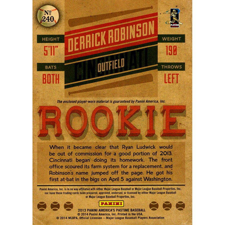 Derrick Robinson Cincinnati Reds 2013 Panini America's Pastime Baseball Card #240. This is numbered 8 of 25.