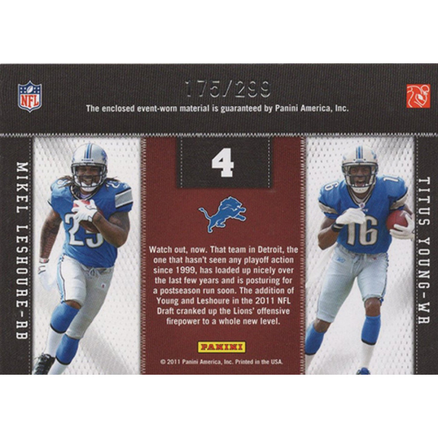 Detroit Lions Mikel Leshoure and Titus Young 2011 Panini Threads Rookie Collection Materials Football Card #4. This is numbered 175 of 299.