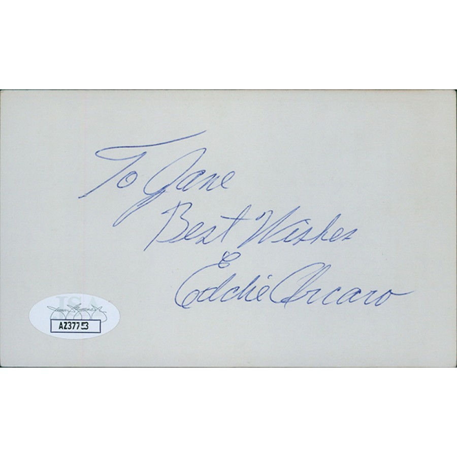 Signed Eddie Arcaro 3x5 index card in blue ink personalized to "Jane". This item has been certified by James Spence Authentication (JSA) with sticker affixed to item and matching card. This item is in very good to excellent condition.
