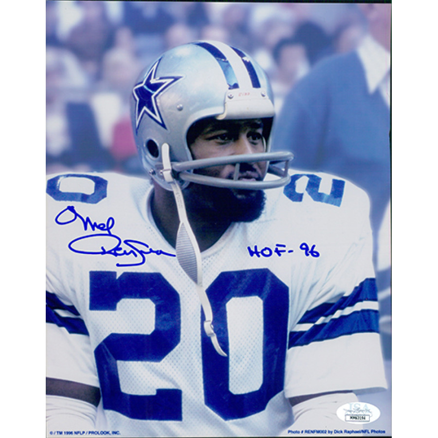 Signed Mel Renfro Dallas Cowboys 8x10 glossy finish photo in blue sharpie with "HOF 96" inscription. This is certified by James Spence Authentication (JSA) with sticker affixed to item and matching card.