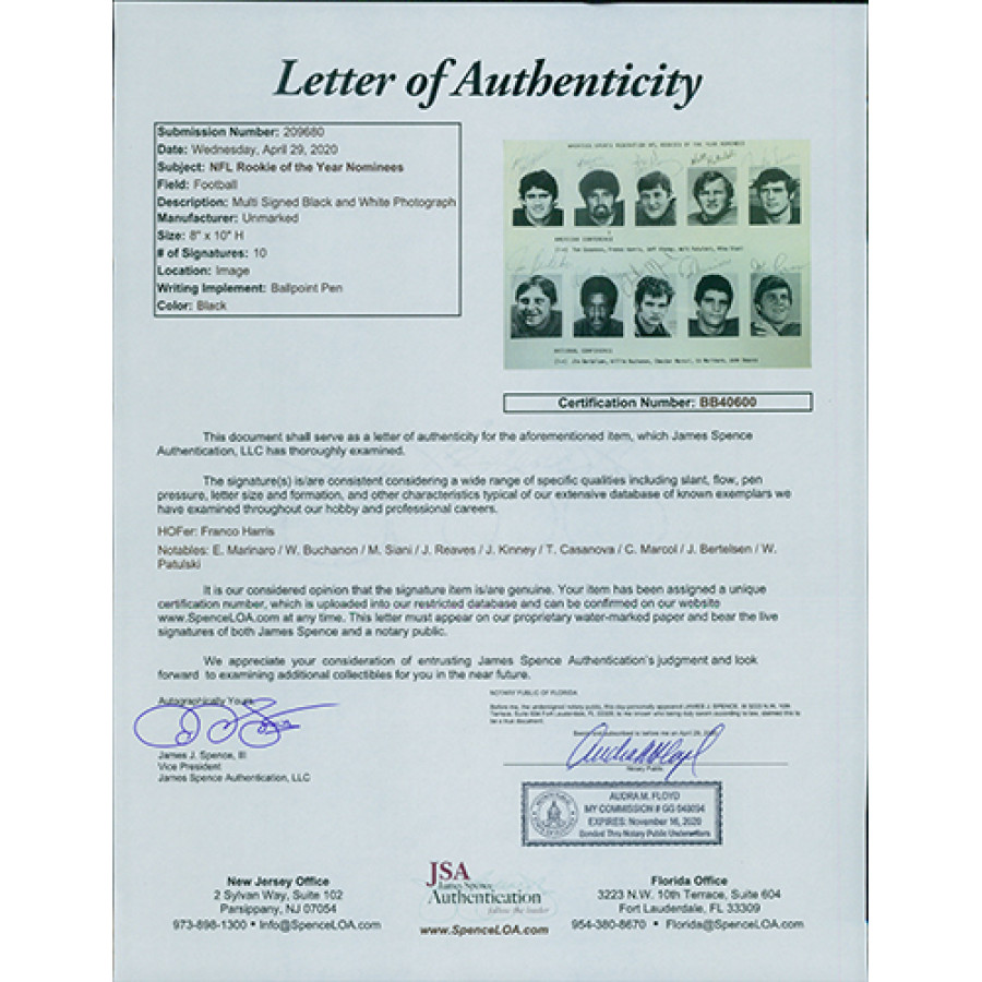 Signed 8x10 glossy finish photo by Tom Casanova, Franco Harris, Jeff Kinney, Walt Patulski, Mike Siani, Jim Bertelsen, Willie Buchanon, Chester Marcol, Ed Marinaro and John Reaves. 10 signatures total. The photo looks to be hand cut and is not cut straight. This is certified by James Spence Authentication (JSA) with sticker affixed to item and matching letter.