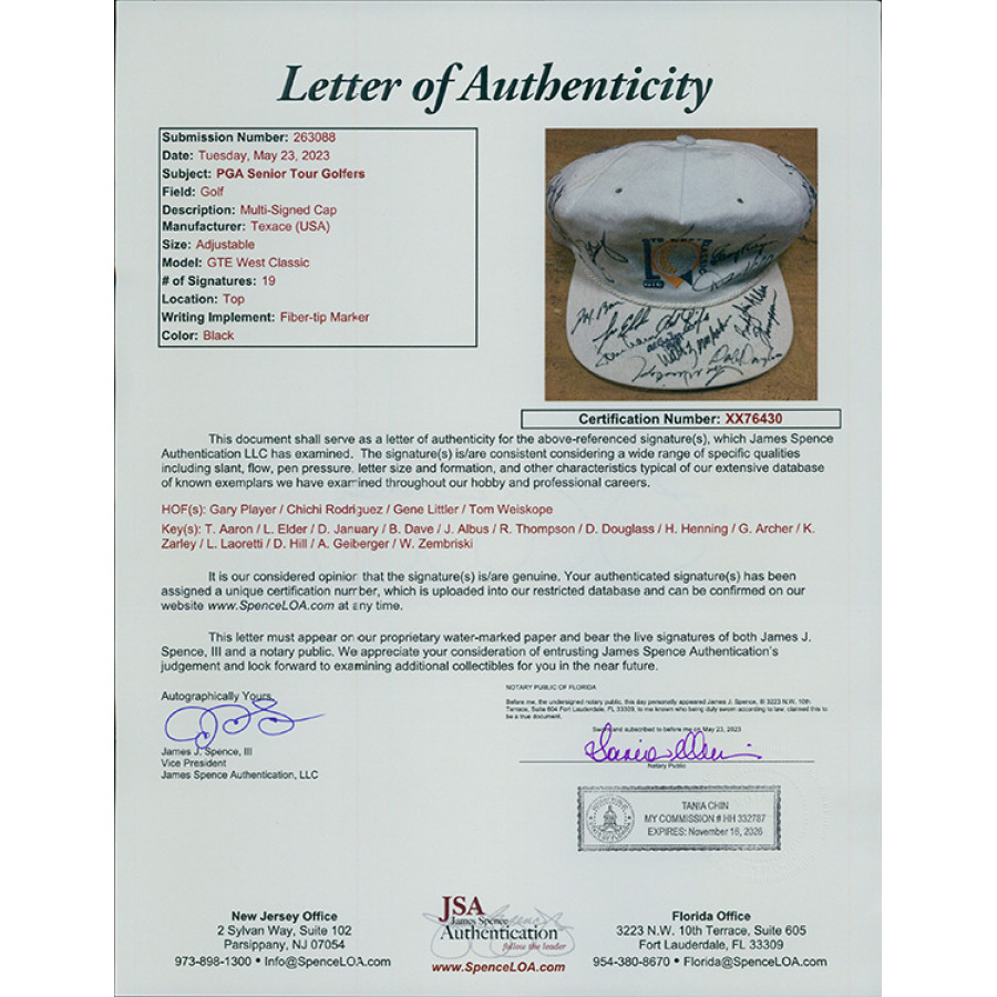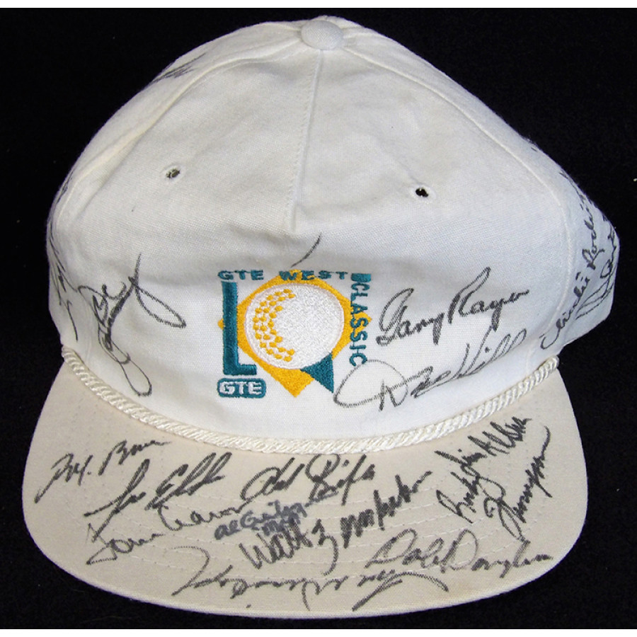 Signed GTE West Classic Hat by 19 golfers in black ink by all. The signatures include Gary Player, Chichi Rodriguez, Gene Littler, Tom Weiskope, Tommy Aaron, Lee Elder, Don January, Jim Albus, Dale Douglas, Harold Henning, George Archer, Kermit Zarley, Larry Laoretti, Dave Hill, Al Geiberger, Walt Zembriski, Rocky Thompson and two others. Hat has been worn by somebody and shows dirt and stains throughout. This item has been certified by James Spence Authentication (JSA) with sticker on item and matching letter of authenticity.