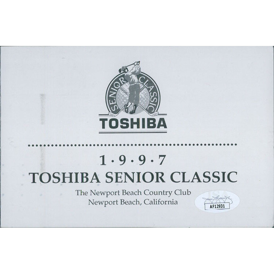 Signed George Archer 1997 Toshiba Senior Classic used scorecard in black ink. The pamphlet measures 4x12 inches when folded out. The pamphlet does show use and has creases, scratches, kinks and other markings. This item has been certified by James Spence Authentication (JSA) with sticker on item and matching cert.