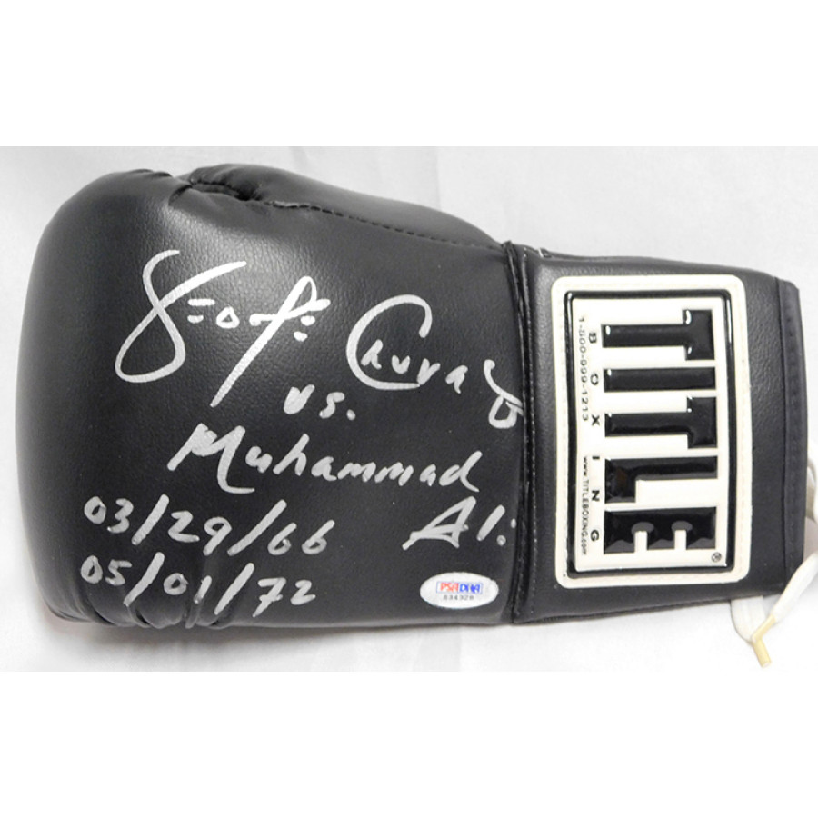 Signed George Chuvalo Title Black Boxing Glove in silver sharpie with inscription. This item has been certified by Professional Sport Authenticator (PSA) and will come with a sticker on the item and matching card.