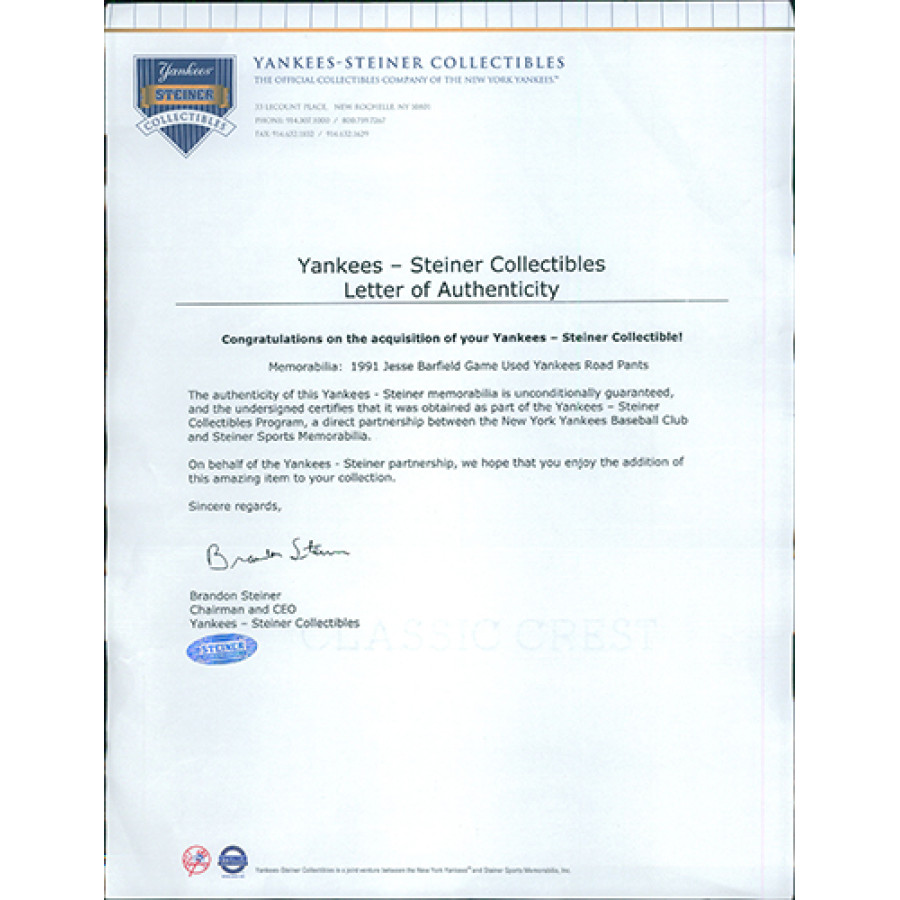 Jesse Barfield New York Yankees 1991 Game Used Road Pants. The pants do show some light use. The pants are certified by Steiner Collectibles with sticker affixed to item and matching letter.