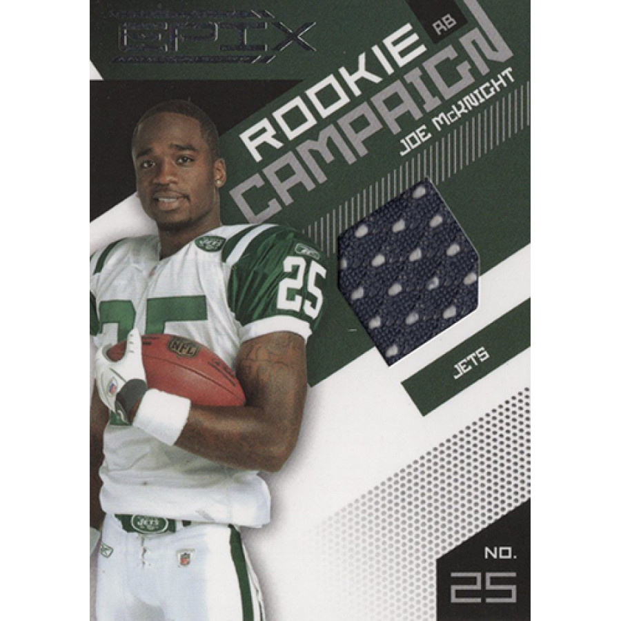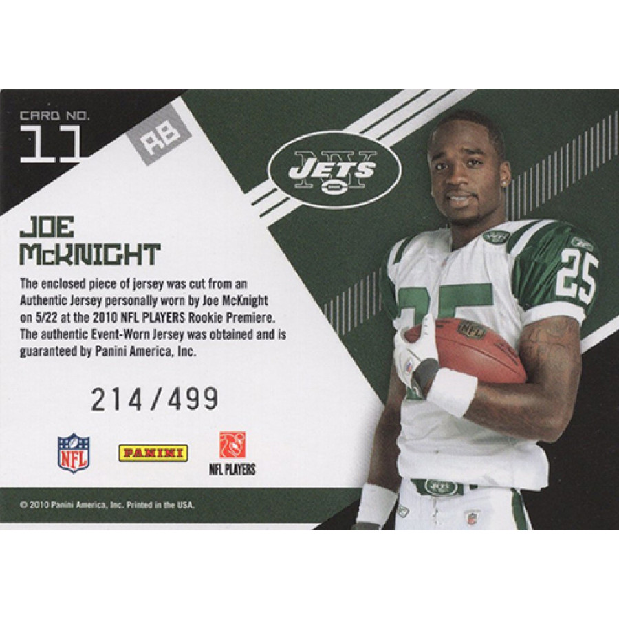 Joe McKnight New York Jets 2010 Epix Rookie Campaign Materials Jersey Football Card #11. It is numbered 214 of 499.