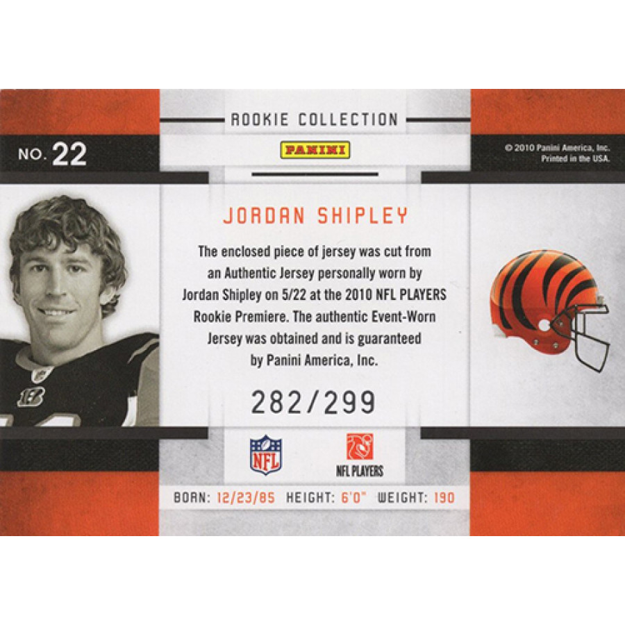 Jordan Shipley Cincinnati Bengals 2010 Panini Threads Rookie Collection Football Card #22. this is numbered 282 of 299.