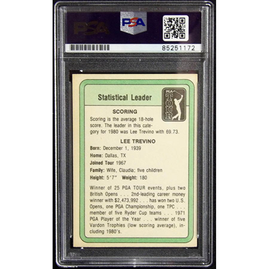Signed Lee Trevino 1981 Donruss PGA Tour Statistical Leader golf card in black ink. This item is certified by Professional Sports Authenticators (PSA) encapsulated.