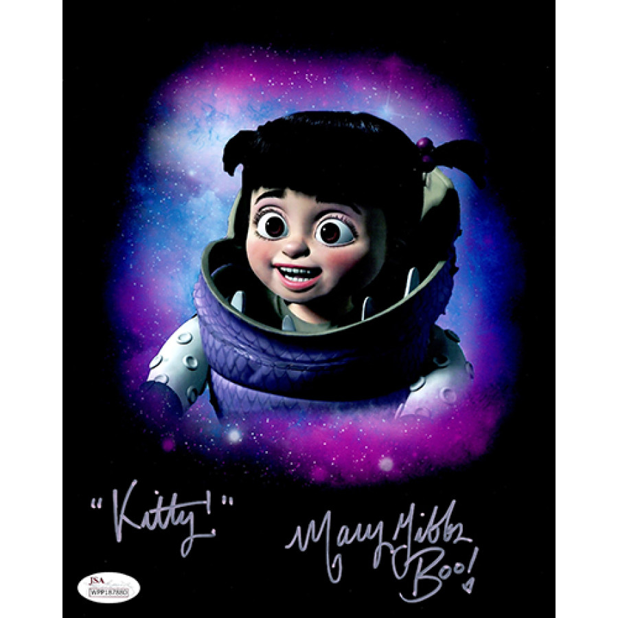 Signed Mary Gibbs 8x10 Matte Photo in pink deco with inscription "Kitty" from the movie Monsters, Inc. This autograph has been witnessed and authenticated by James Spence Authentication (JSA) with sticker affixed to item and matching card. The signing took place on 2/2/19.