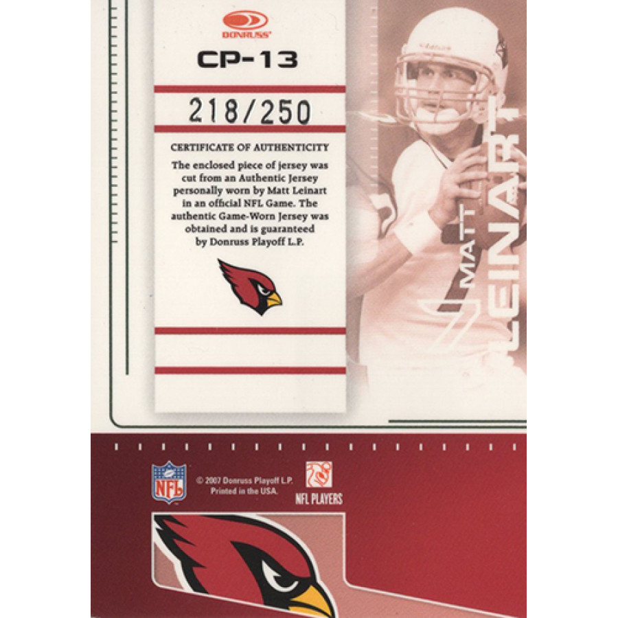 Matt Leinart Arizona Cardinals 2007 Leaf Certified Materials Potential Card #CP-13. This is numbered 218 of 250.