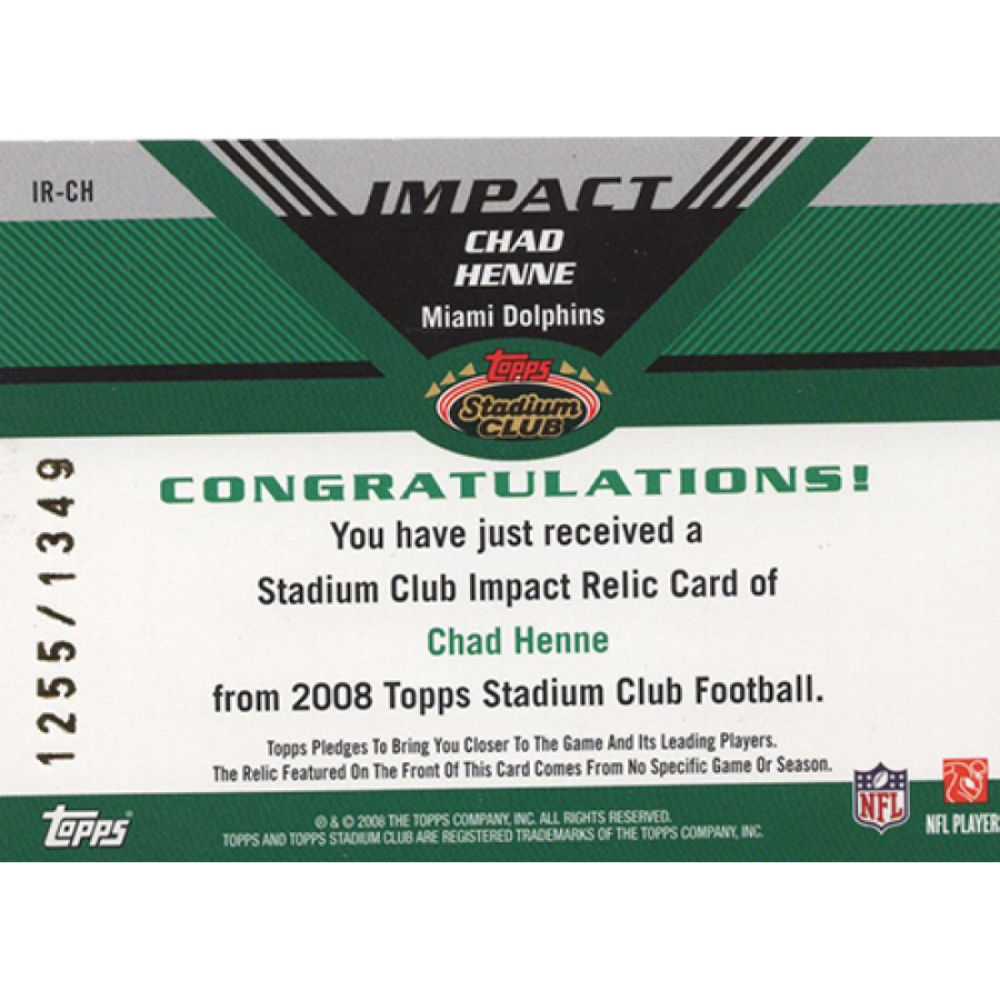 Chad Henne Miami Dolphins 2008 Topps Stadium Club Impact Relic Jersey Football Card #IRCH. This is numbered 1255 of 1349.