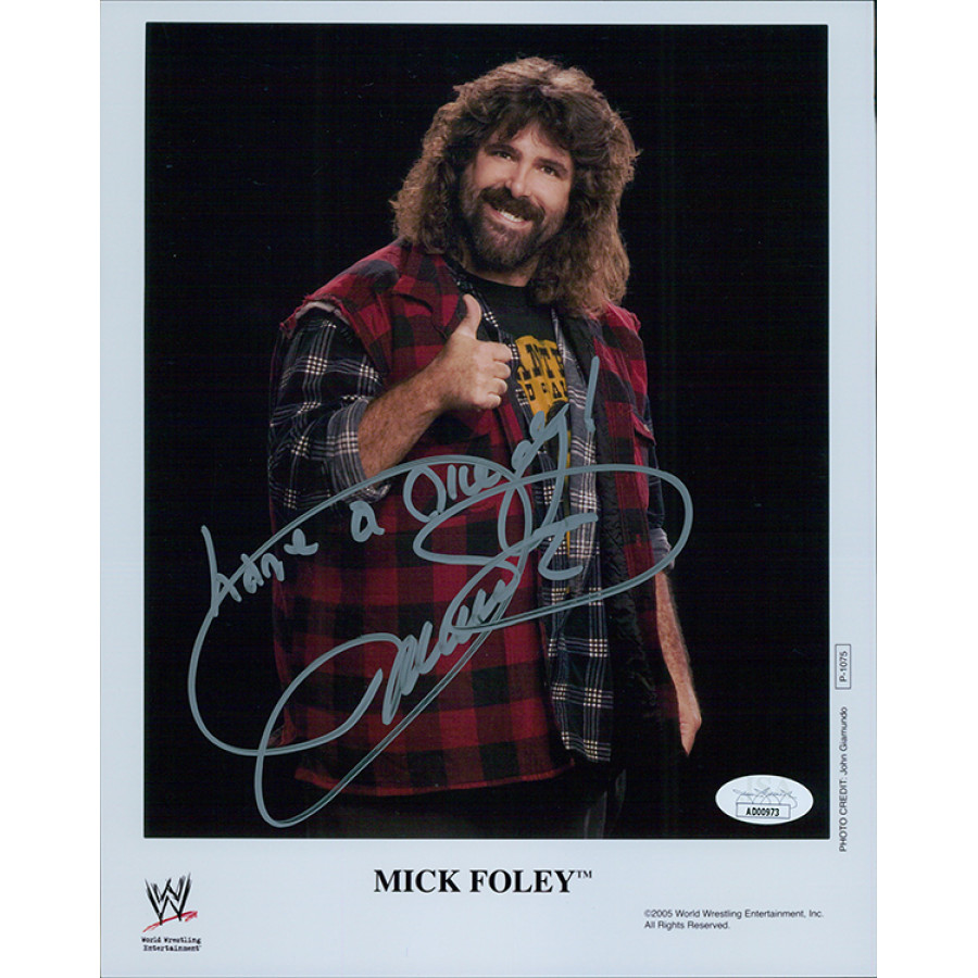 Signed Mick Foley 8x10 glossy finish photo in silver sharpie. This item has been certified by James Spence Authentication (JSA) with sticker affixed to item and matching card.