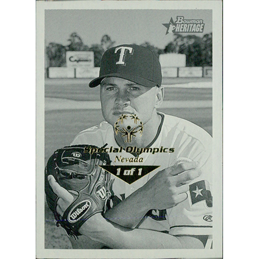Rick Helling Texas Rangers 2001 Bowman Heritage baseball card #193. The is embossed Special Olympics Nevada 1 of 1.