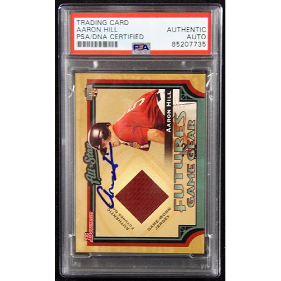 Signed Aaron Hill Toronto Blue Jays 2005 Bowman Futures Game Gear relic baseball card #FGG-AH in blue sharpie. This item is certified by Professional Sports Authenticator (PSA) encapsulated.