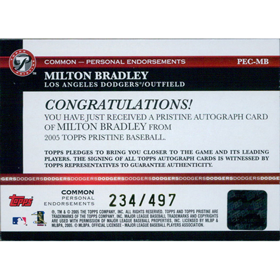Milton Bradley Los Angeles Dodgers Signed 2005 Topps Pristine Personal Endorsements Baseball Card #PEC-MB. This is numbered 234 of 497.
