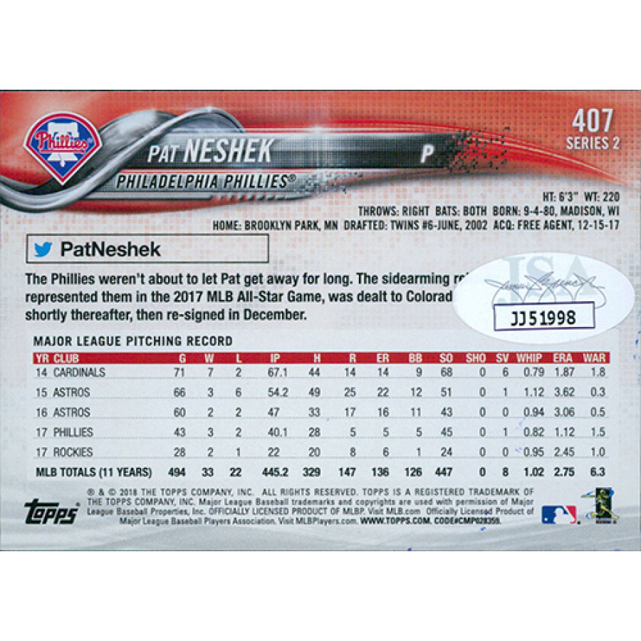 Pat Neshek Philadelphia Phillies Signed 2018 Topps Card #407 JSA Authenticated