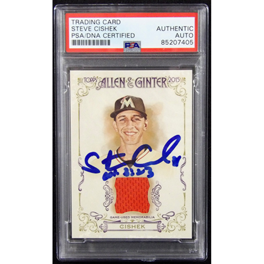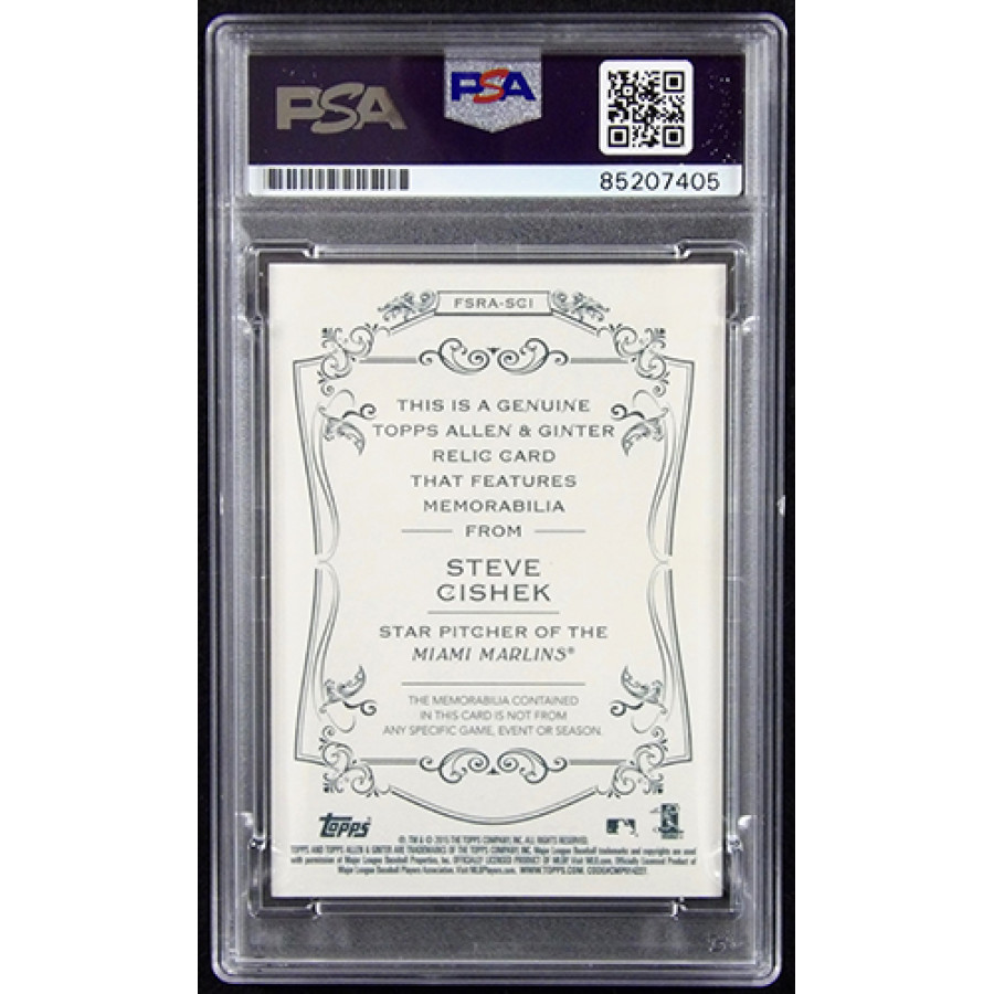 Signed Steve Cishek Miami Marlins 2015 Topps Allen & Ginter's Relic baseball card #FSRA-SCI in blue sharpie. This item is certified by Professional Sports Authenticators (PSA) encapsulated.