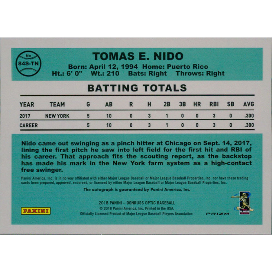 Signed Tomas Nido 2018 Panini Donruss Optic Bronze Prizm Rated Rookie Baseball Card #84S-TN.