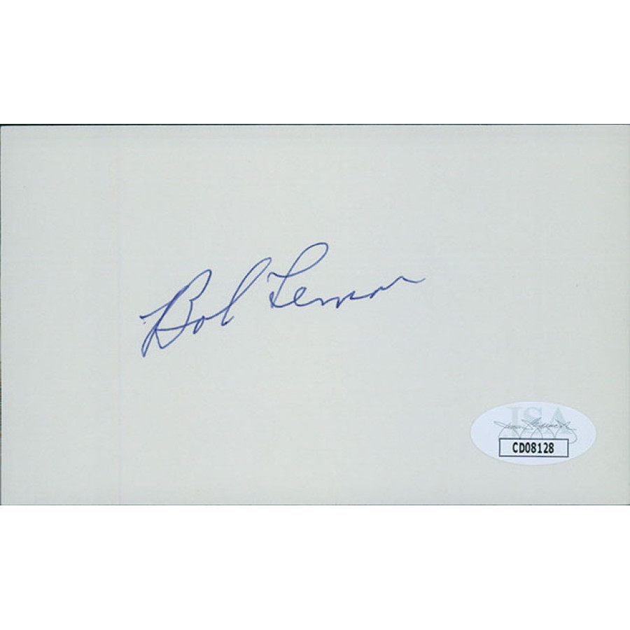 Signed Bob Lemon 3x5 Index Card in blue ink. This item has been certified by James Spence Authentication (JSA) with sticker affixed to item and matching card.