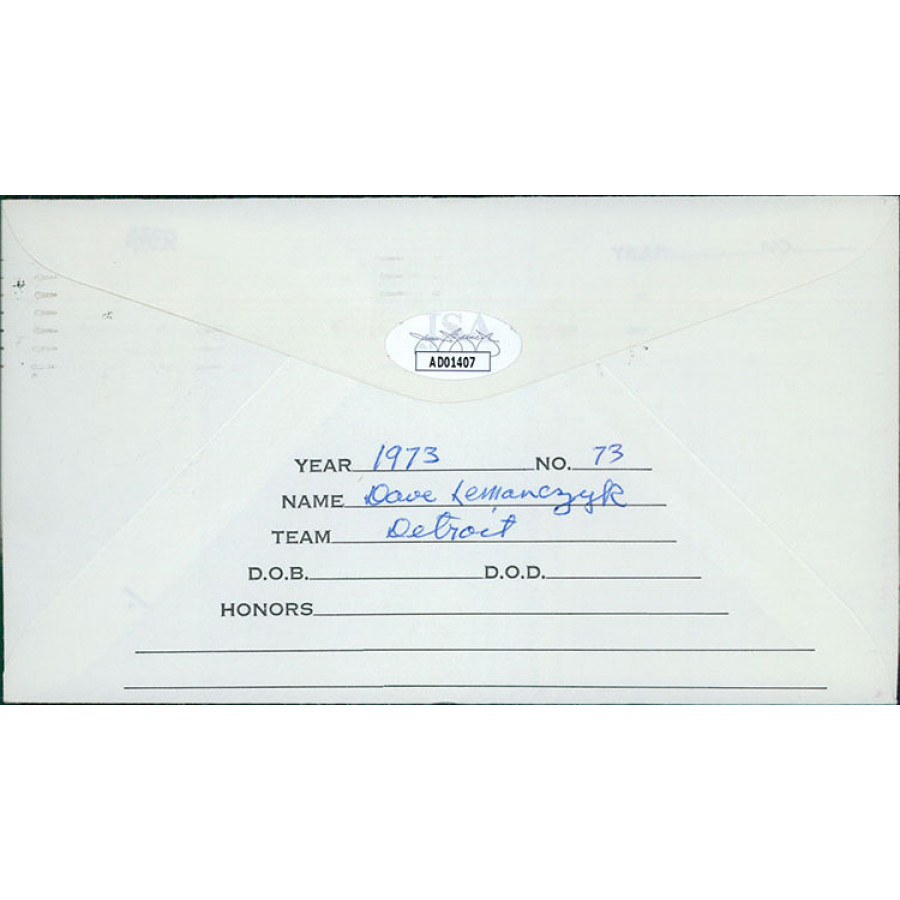 Signed Dave Lemanczyk Envelope Cachet in blue pen. The card is affixed to the front of the envelope and there is writing on the back. This item has been certified by James Spence Authentication (JSA) with sticker on item and matching card.
