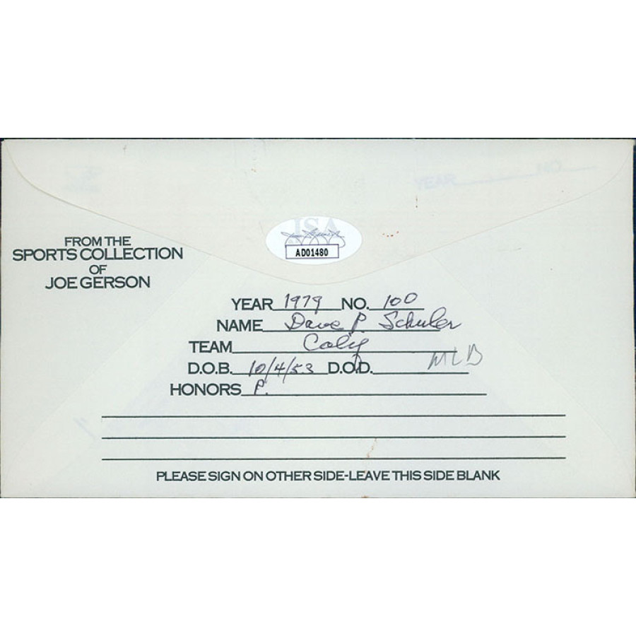 Signed Dave Schuler Envelope Cachet in blue sharpie. There is some writing on the back. This item has been certified by James Spence Authentication (JSA) with sticker on item and matching card.