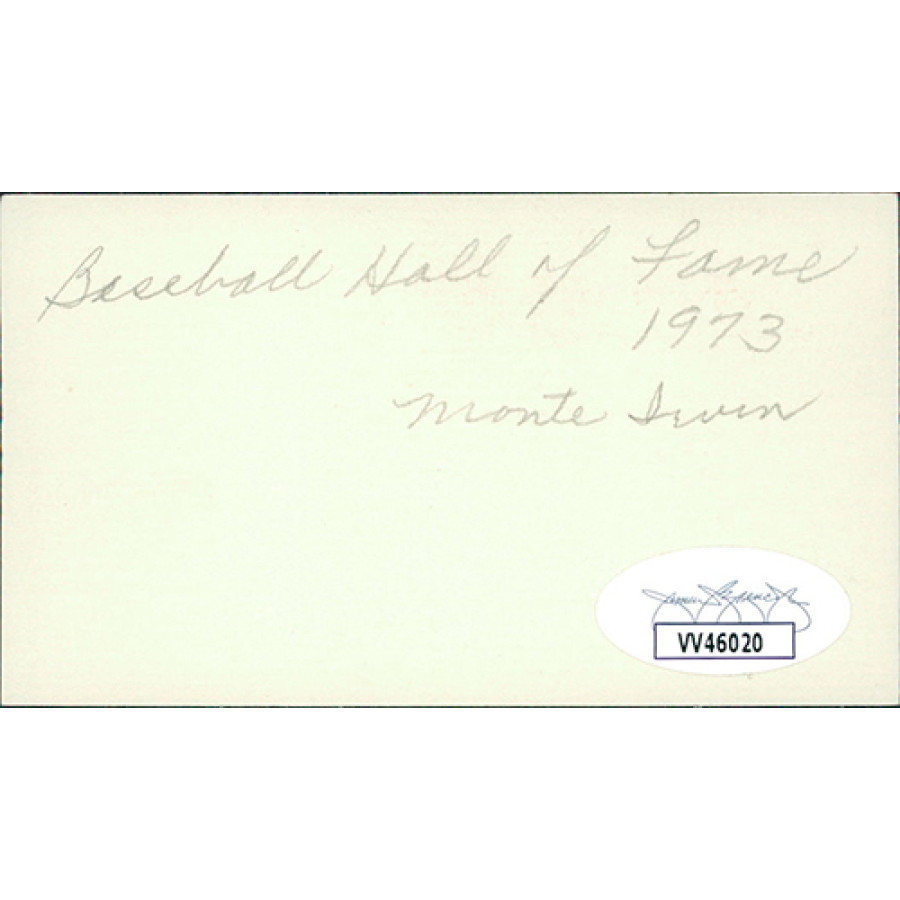 Signed Monte Irvin 2x3.5 Autograph Card in blue pen. This item has been certified by James Spence Authentication (JSA) with sticker affixed to item and matching card.