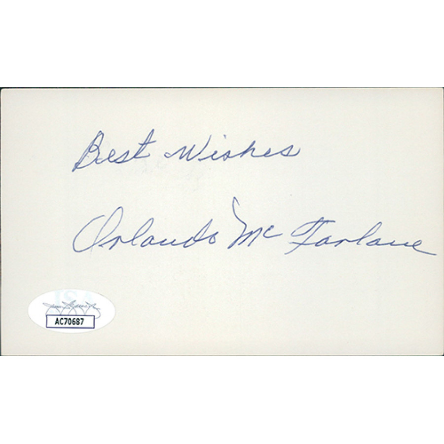 Signed Orlando McFarlane 3x5 Index Card in blue ink. This item has been certified by James Spence Authentication (JSA) with sticker affixed to item and matching card.